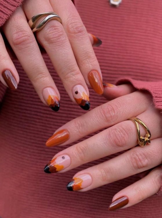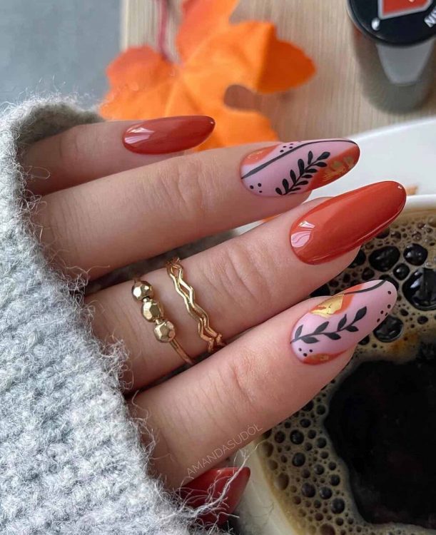 Темно-оранжевий і мерехтливий мідний лак — ще одне поєднання кольорів, що ідеально підходить для осені. Малюнки у вигляді чорного листя та абстрактні деталі зроблять дизайн більш ніжним та романтичним.