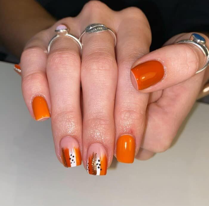 Цей дизайн являє собою абстрактний френч, що складається з хаотичних мазків помаранчевого, білого і золотистого відтінків. Розсип чорних крапок додає манікюру оригінальності. Такий нейл-арт чудово виглядатиме на нігтях невеликої довжини.