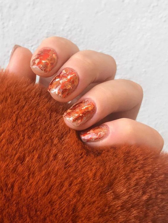 Металеві пластівці – чудове доповнення до будь-якого дизайну нігтів. Вони актуальні завжди. Однак мідні та яскраво-жовтогарячі пластівці виразно асоціюються з осіннім листям, що робить такий манікюр ідеальним для цієї пори року.