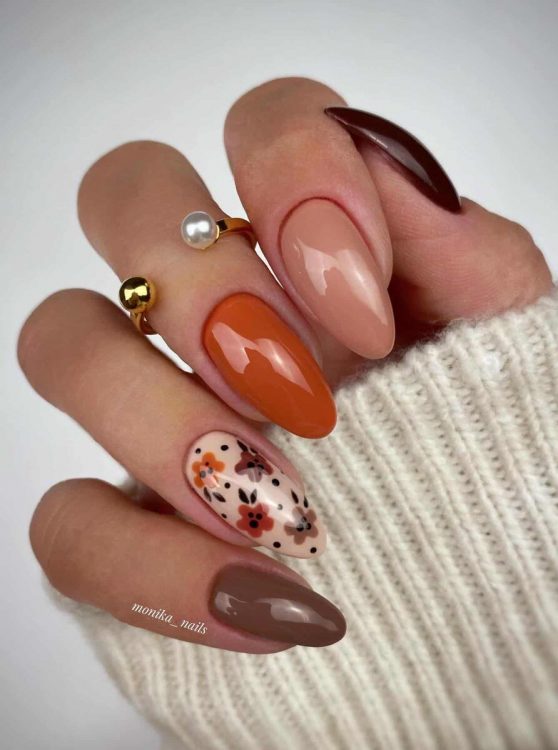 Бежеві, коричневі та оранжеві нігті з квітами.