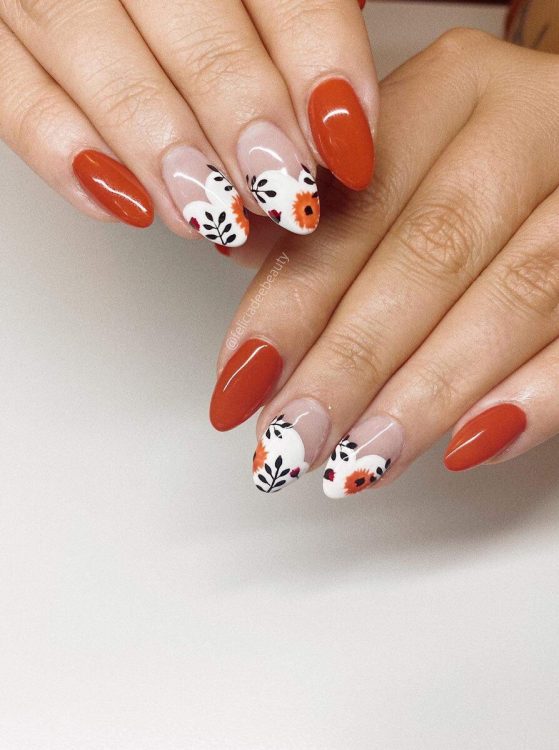 У цьому нейл-арті використовується улюблене багатьма поєднання глянсового та матового фінішу. Помаранчевий колір робить дизайн сміливим та яскравим, золота фольга додає до нього нотки розкоші, а флористичні візерунки нагадують про осінь.