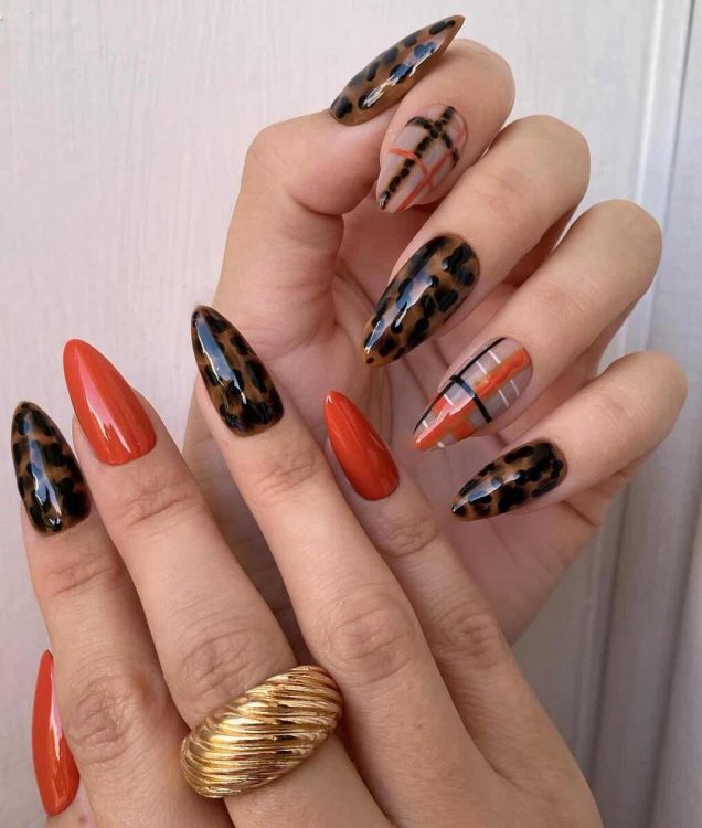 У цьому манікюрі поєднуються два види дизайну – клітинка та черепаший принт. Перша нерозривно асоціюється з пледами і прохолодною погодою, тому ідеально підходить для осіннього нейл-арту, а панцир черепахи – це шикарний і модний штрих, який приголомшливо виглядає у поєднанні з яскраво-оранжевим кольором.