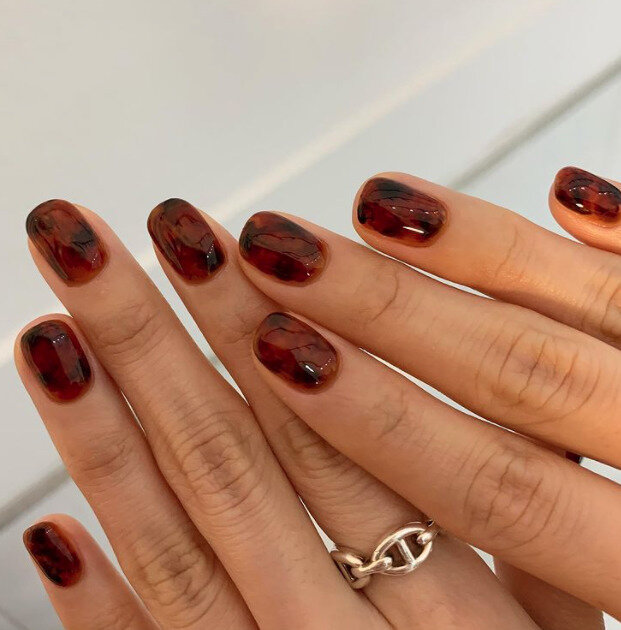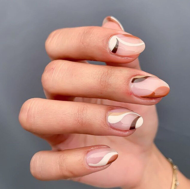 Нюдовий лак з абстракціями, намальованими в коричневій палітрі також виглядатиме дорого і сучасно на ваших ручках в цьому сезоні.