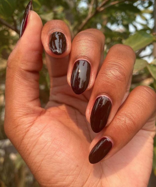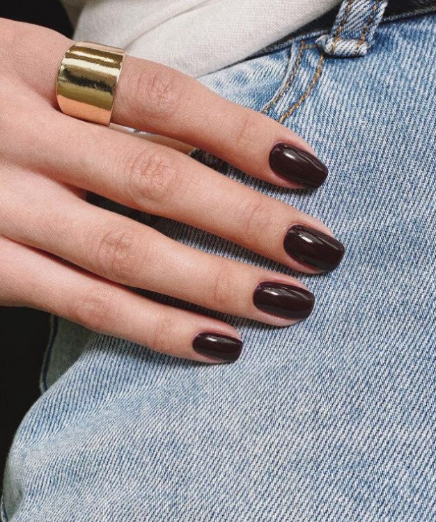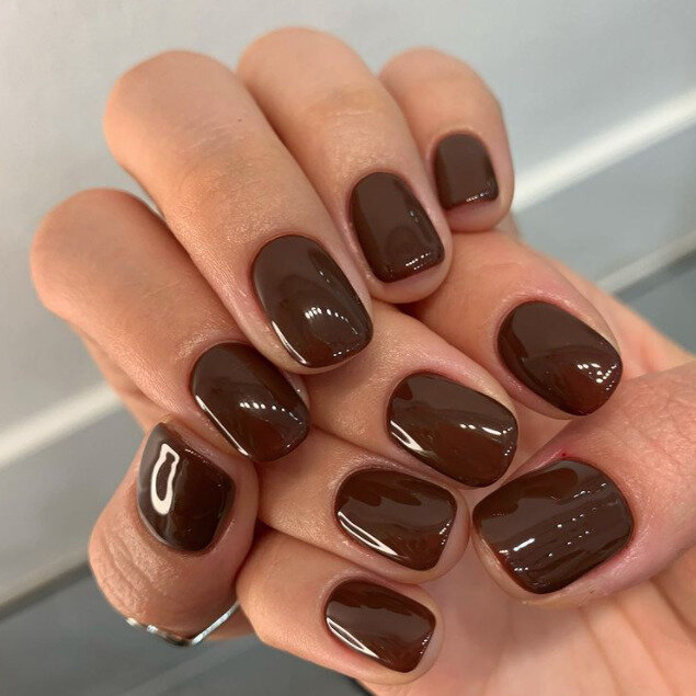 Якщо ви мінімаліст і холодно ставитеся до різноманітного дизайну на нігтьовій пластині, тоді сміливо вибирайте для себе однотонне глянсове або матове покриття, виконане в благородному шоколадному кольорі. Шоколадна палітра дуже багатогранна, тож кожна модниця обов’язково знайде свій ідеальний колір сучасного манікюру.