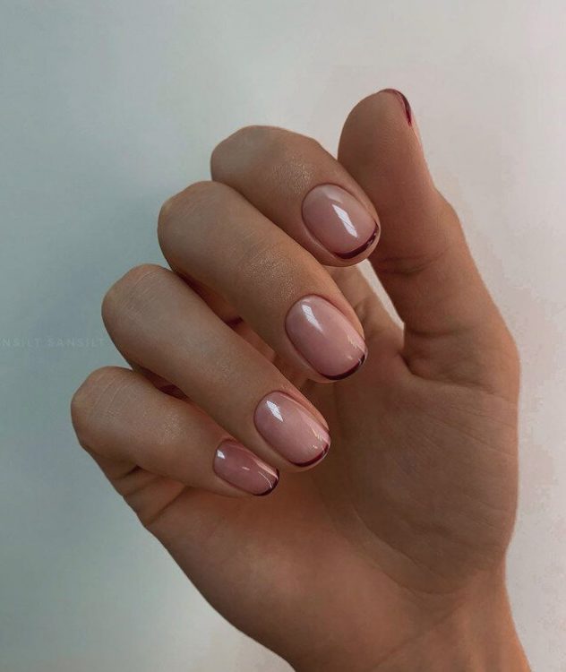 Кольоровий французький манікюр так само займає лідируючі позиції в сучасній індустрії краси. Класичний білий колір в даному дизайні можна сміливо замінити на шоколадний – вийде ефектний і благородний манікюр.
