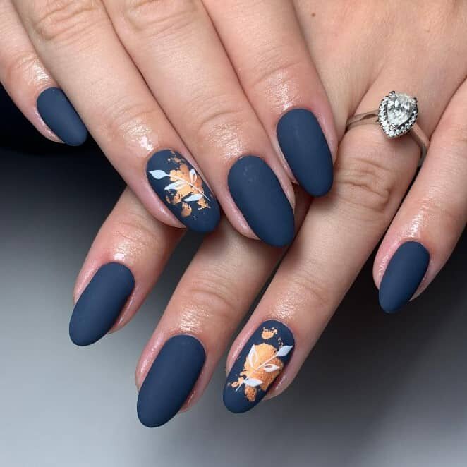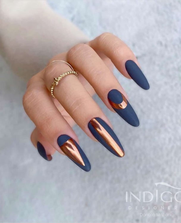Розкішні бронзові акценти виглядають чудово у поєднанні з матовим темно-синім лаком. Такий манікюр ідеально підійде для офіційних заходів.