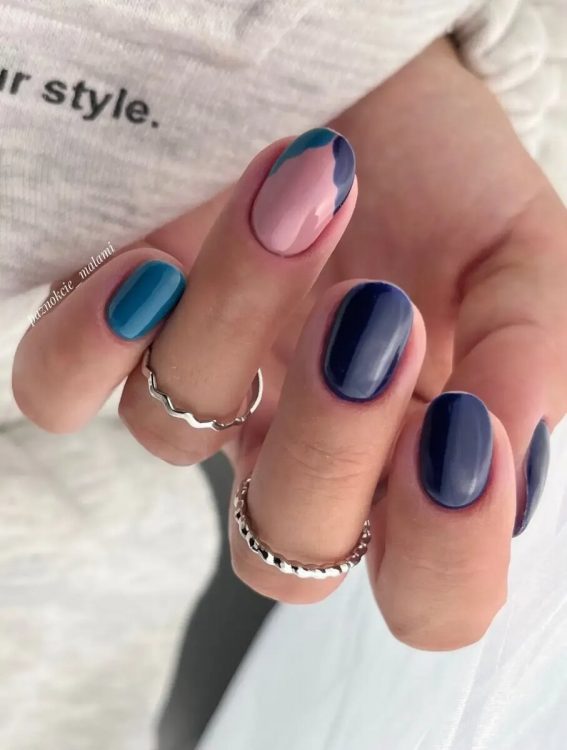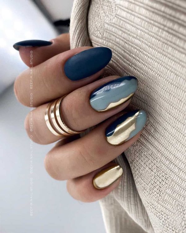 У цьому манікюрі поєднуються темно-синій, пастельно-блакитний та золотий колір, а також глянсова та матова текстура. Він дуже багатогранний, але при цьому цілісний та гармонійний.