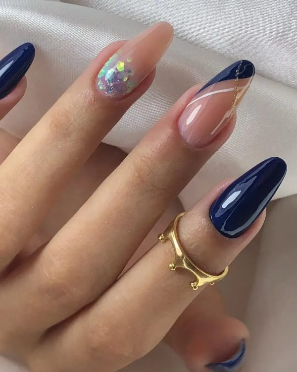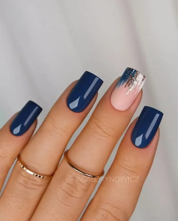 У цьому темно-синьому манікюрі акцентні нігті прикрашені золотим декором і блискітками, що переливаються.