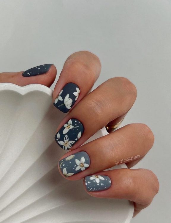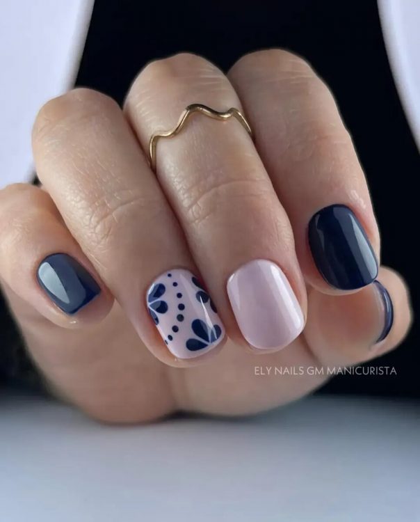 У цьому манікюрі акцентні нігті молочного кольору прикрашені темно-синіми квітами та крапками – просто та красиво!