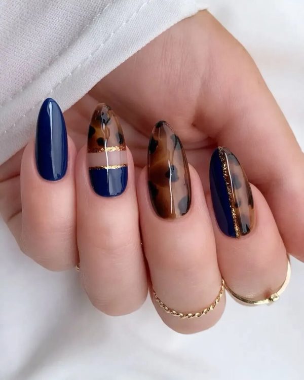 Черепаховий принт сьогодні є однією з найпопулярніших тенденцій у манікюрі, тому якщо ви хочете створити модний образ, поєднайте його з насиченим темно-синім відтінком.