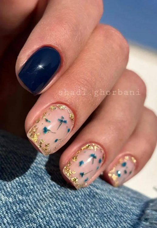 У цьому дизайні лише один ніготь на кожній руці пофарбований у глянсовий темно-синій колір, а решта покрита напівпрозорим лаком і прикрашена мініатюрними синіми сухоцвітами та золотою фольгою.