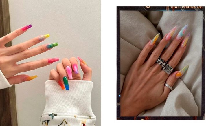 Зверніть увагу на аерографні дизайни у яскравих весняних відтінках: жовтому, блакитному, рожевому. Найкраще незвичайне напилення виглядає на довгих нігтях.