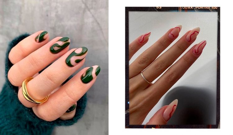 Манікюр із хвилястими лініями добре виглядає на нігтях овальної форми. Якщо ви віддаєте перевагу квадратній, попросіть майстра зробити лінії більш тонкими та графічними.
