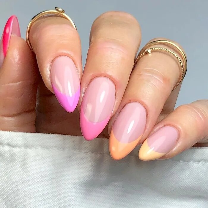 Це весняний варіант френча виконаний в грайливій гамі пастельних відтінків – яскраво-рожевому, ніжно-персиковому та приглушено-жовтому. Ви отримаєте життєрадісний та шикарний манікюр, який чудово підійде для зустрічі яскравих та теплих весняних днів.