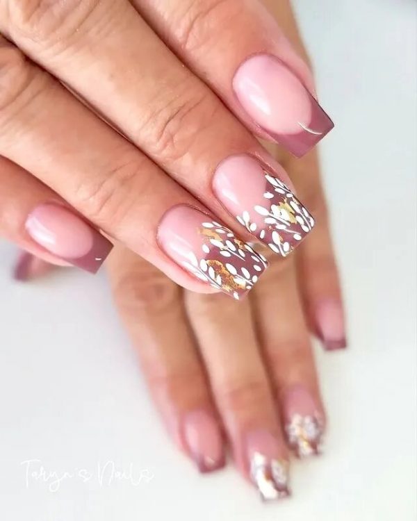 Цей манікюр є вишуканим поєднанням ніжно-бузкових французьких кінчиків, білих візерунків у вигляді пелюсток і акцентів із золотої фольги.