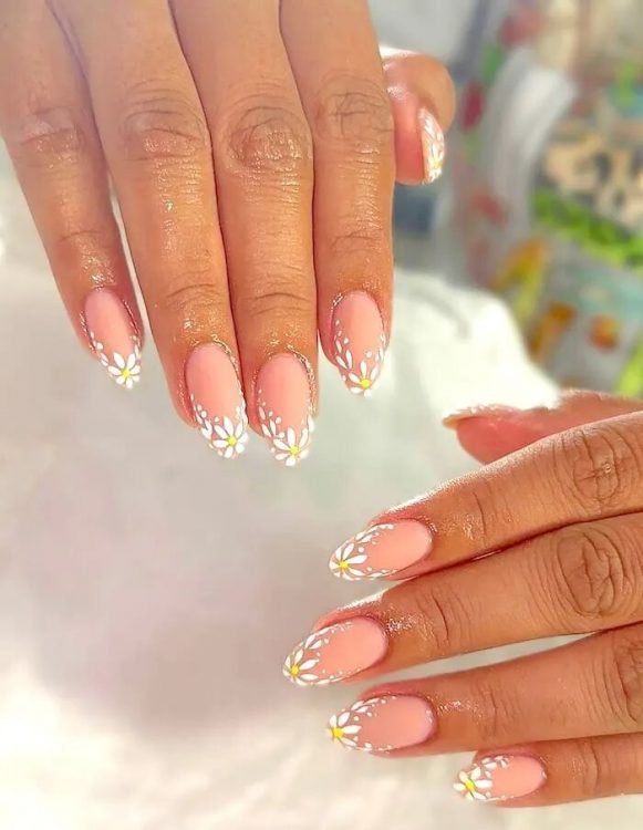 У цьому дизайні використовується ніжна рожева основа, яку доповнюють романтичні французькі кінчики у вигляді білих пелюстків ромашок. З ним ваші нігті нагадуватимуть квітучий весняний садок.