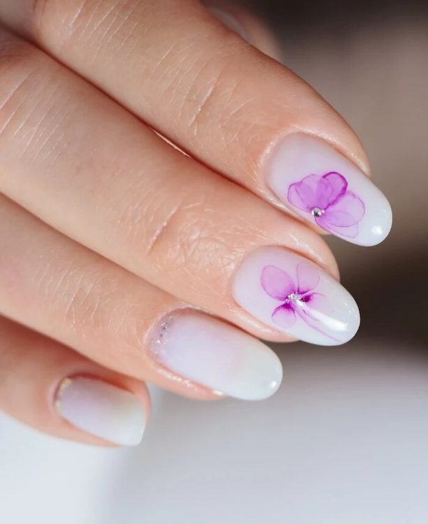Цей дизайн чудово передає атмосферу весни завдяки прозорій молочній основі, прикрашеній ніжними фіолетовими кольорами з мініатюрними стразами в центрі.