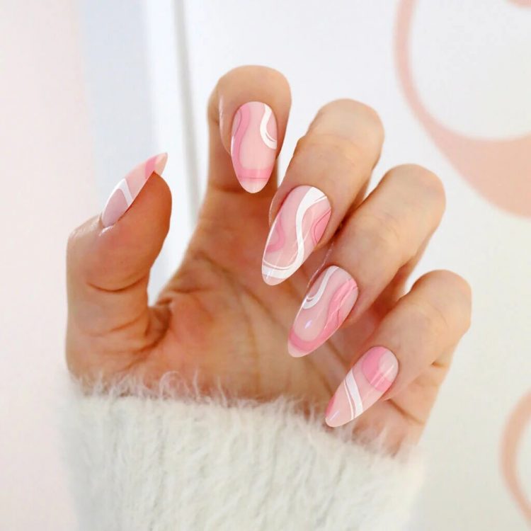 Весна – це пора року, коли енергія б’є ключем. Підкресліть це за допомогою свого манікюру, обравши в якості дизайну динамічний візерунок з білосніжних та рожевих хвилястих ліній.