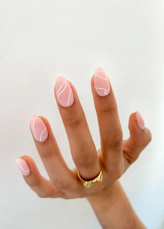 Якщо ви є шанувальницею рожевого манікюру, але при цьому однотонне покриття встигло вам набриднути, додайте мінімалістичні та елегантні візерунки у вигляді тонких хвилястих білих ліній.