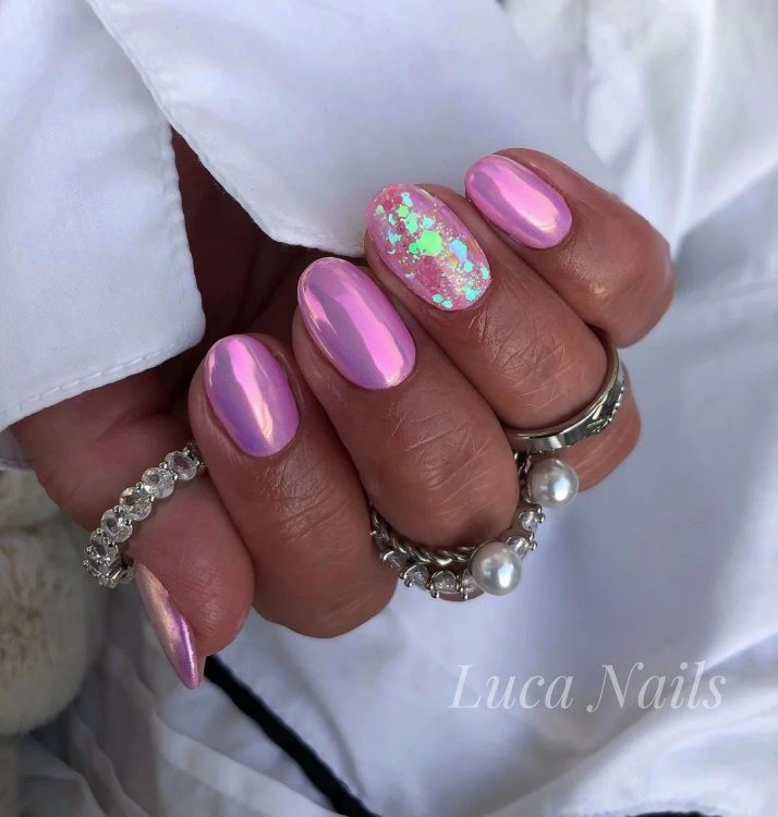 Хромований топ ідеально підходить для яскравого дизайну. Він гарно переливається на сонці та миттєво підіймає настрій. Палітра весняних рожевих відтінків величезна. Виберіть той, який вам більше до вподоби, і насолоджуйтесь своїм блискучим манікюром.