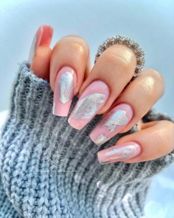 Всі кольори фантастично виглядають із сріблястим глітером, і різноманітні відтінки рожевого не є винятком. Срібні візерунки на рожевій основі – ідеальне рішення для милого та насиченого весняного манікюру. Це один із найпоширеніших трендів, який ніколи не втрачає актуальності.