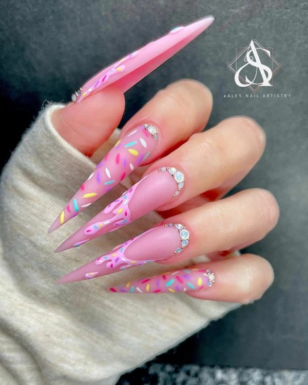 Цей яскравий манікюр точно подарує заряд весняного настрою. Прикрасьте ніжно-рожеві нігті малюнками, що імітують солодку глазур. Додати в барвистий нейл-арт жіночності та витонченості можна, виділивши лунки блискучими стразами.