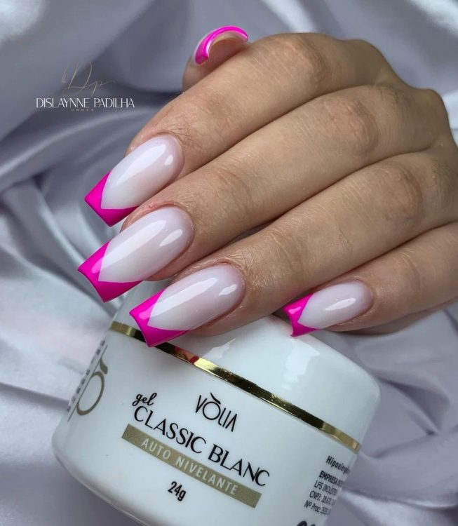 Дизайн із V-подібними кінчиками залишається на піку популярності. Виберіть основою нюдовий лак, а кінчики покрийте яскраво-рожевим кольором, щоб отримати ніжне і романтичне поєднання. Варто відзначити, що такий нейл-арт найкраще виглядає на довгих нігтях мигдалеподібної чи квадратної форми.