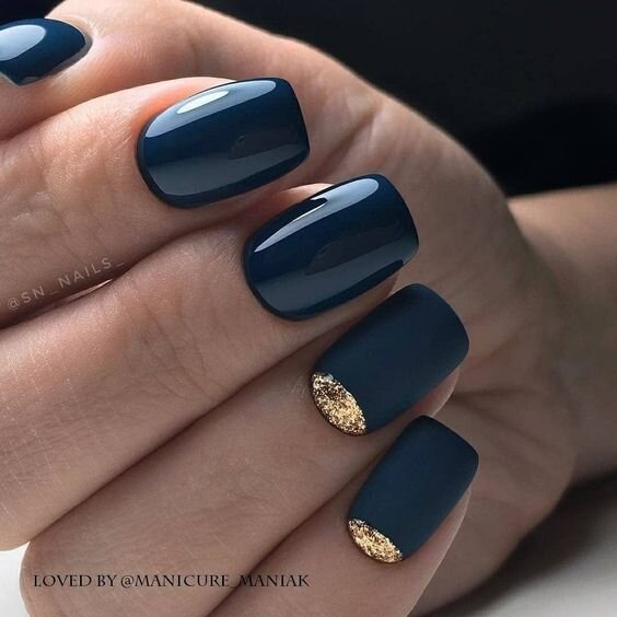 Насичений синій колір – ідеальний відтінок, який буде особливо актуальним і затребуваним цього сезону. Благородний синій манікюр можна урізноманітнити за допомогою золотого декору та матового фінішу.