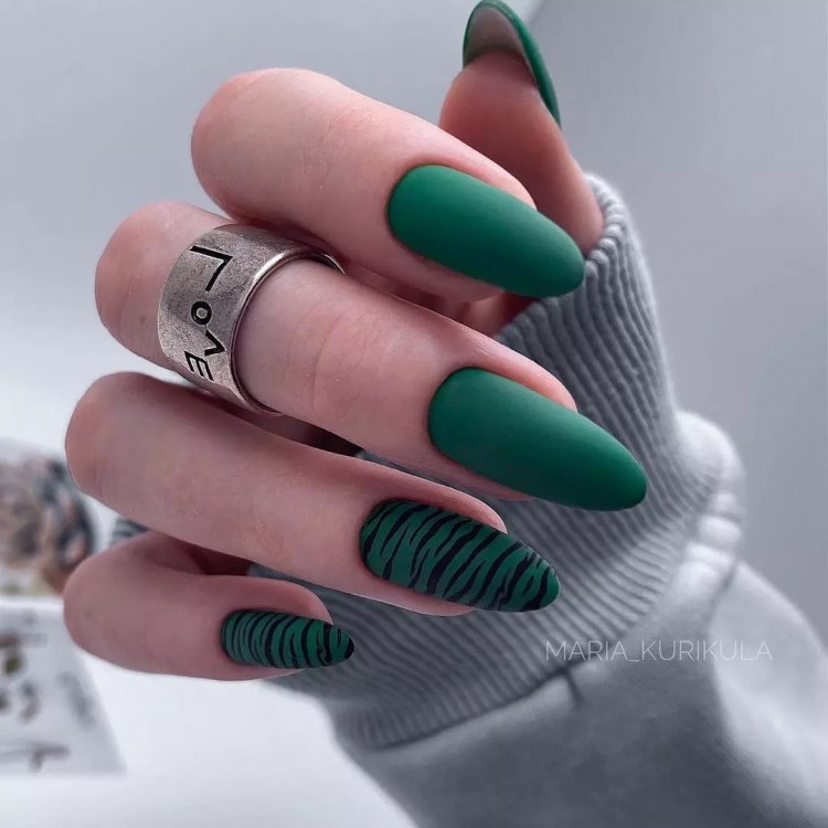 Зелений актуальний не лише у літній період, а й у зимовий сезон. Тільки для відповідного манікюру краще вибрати глибокий темний колір, що створює відчуття розкоші та ретро-стилю. Можна вибирати цей колір лаку у однотонному виконанні або прикрашати цим тоном барвисті малюнки.