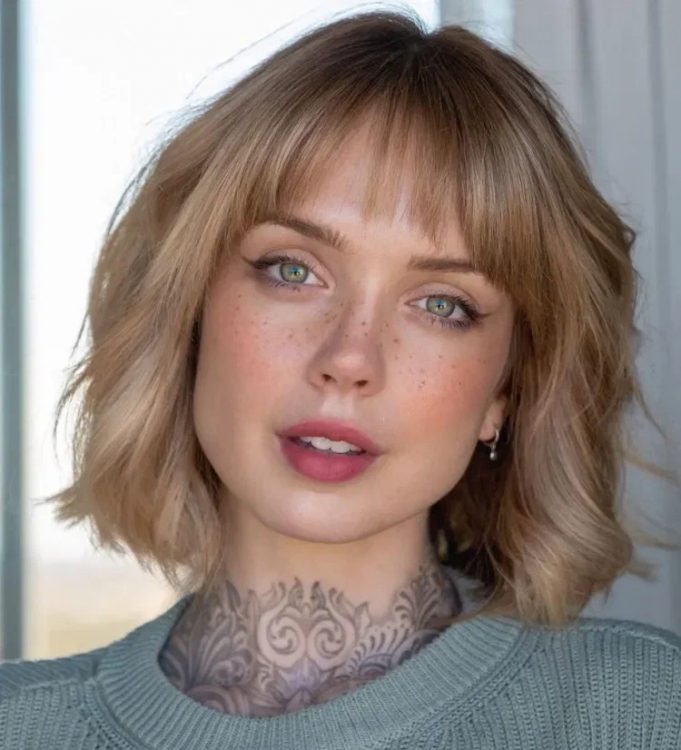 Контраст між прямим, густим чубчиком і скуйовдженим бобом може створити разючий образ. Накрутіть волосся, щоб отримати невимушений текстурований вигляд. А короткий чубчик зробить ваш образ альтернативним але жіночним.