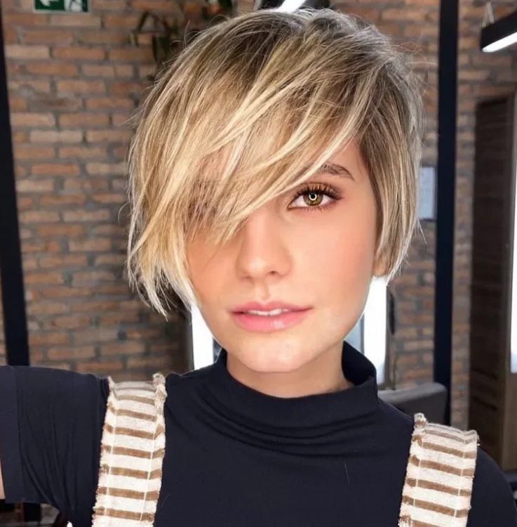 Довгий бічний чубчик із короткою стрижкою завжди добре обрамляє обличчя. Він має глибоку бічну частину і не вимагає особливого укладання. Достатньо просто висушити його під феном. Тож це ідеально, якщо вам потрібно швидко зібратися для якоїсь події! При правильному укладанні стрижка виглядає м’яко, жіночно та дуже стильно.