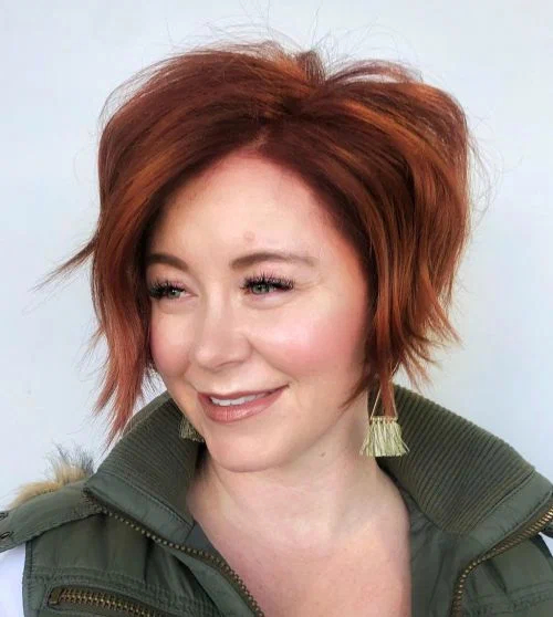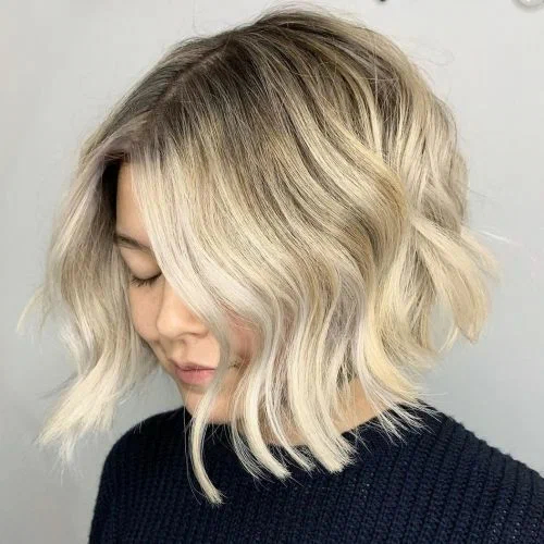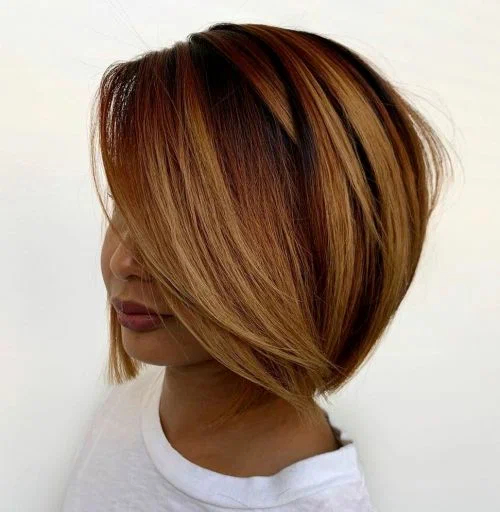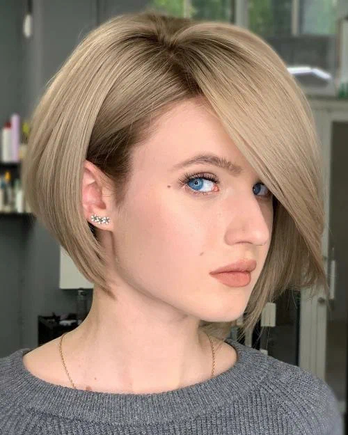 Об’ємний боб з косим чубчиком і легким градуюванням буде виглядати бездоганно на старших красунях, які люблять природний прикореневий об’єм.