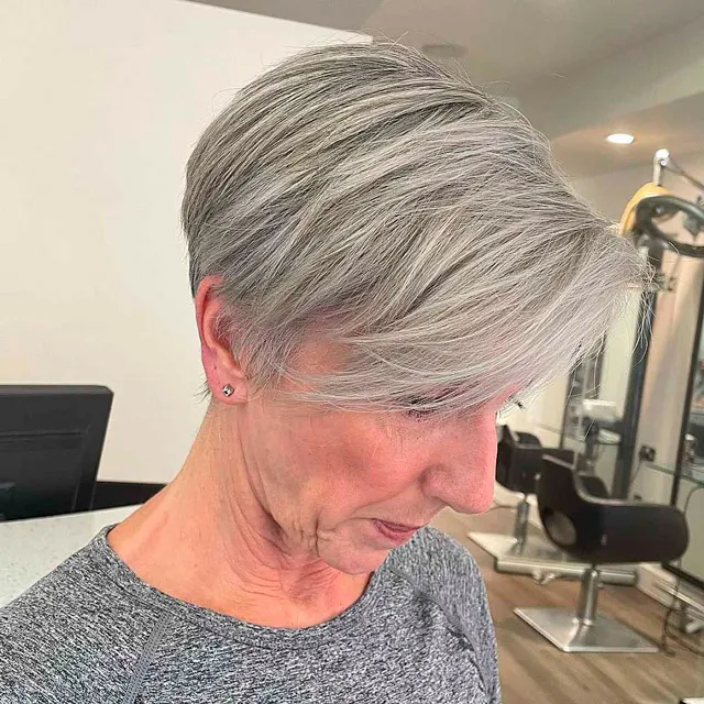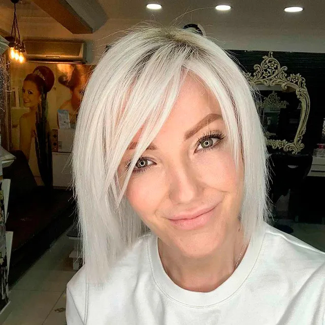 Зачіска з тонким білим волоссям і чубчиком на бік