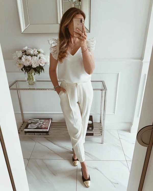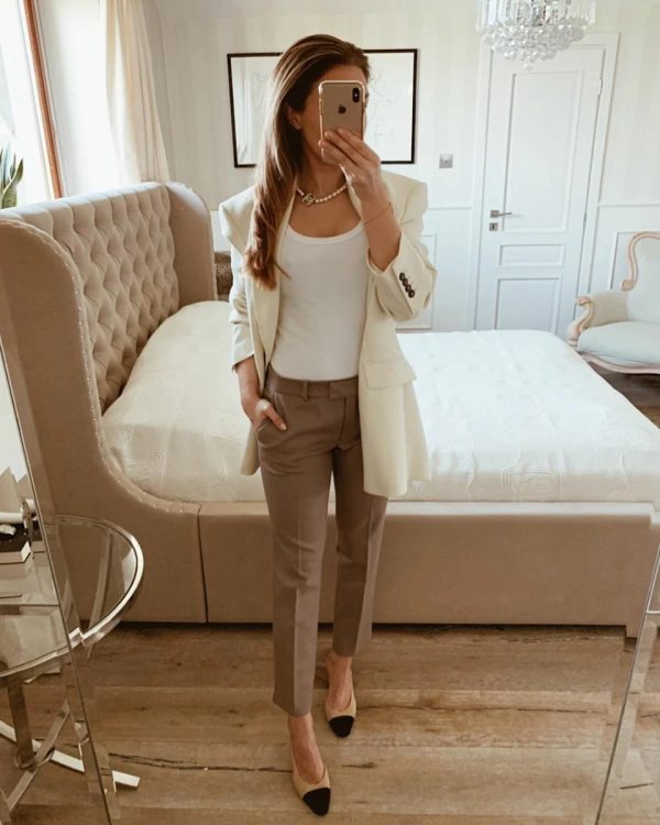 Якщо не хочеться “заморочуватися”, можна купити світлий брючний костюм і носити його в офіс у різних комбінаціях. Наприклад, із топом, блузою, футболкою, сорочкою тощо.