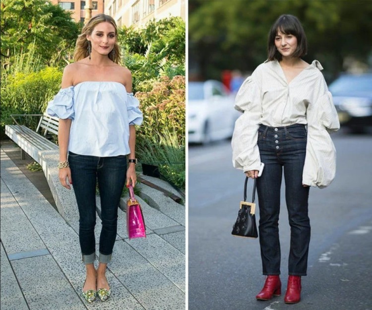Здавалося б, з класичного поєднання блузки і темних джинсів непросто створити ультрамодний образ. Але все залежить від того, який ви підберете верх. Якщо це буде блуза зі спущеними або об’ємними рукавами, то ви не будете виглядати як нудний офісний працівник.