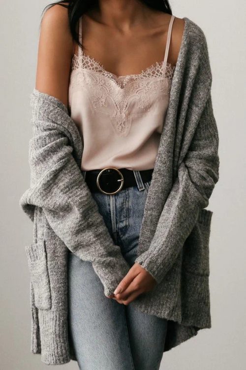 Стилісти пропонують нам приміряти ніжний топ із мереживними вставками з в’язаним оверсайз теплим кардиганом, джинсами та кросівками. Цей образ на кожен день справить позитивне враження на всіх оточуючих.