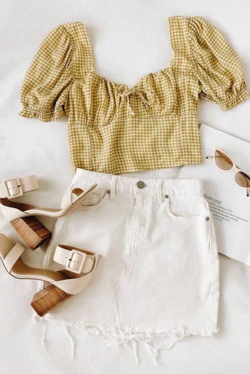 До речі, зверніть увагу, ще одне ефектне поєднання, а саме: міні спідниця з деніму + в’язаний кардиган + жіночний топ з рюшами і мереживом + босоніжки на підборах. У такому аутфіті можна сміливо піти на романтичне побачення.