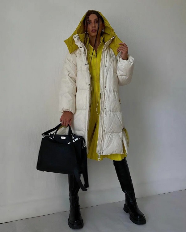 Жіночі силуети з теплої спідниці або трикотажної сукні, одного з головних трендів сезону, в тандемі з пуховиком – вибір дівчат, які віддають перевагу оригінальним поєднанням. У таких образах пуховик чудово замінить звичне пальто, надійно захищаючи від холоду та вносячи свіжий погляд у образ.