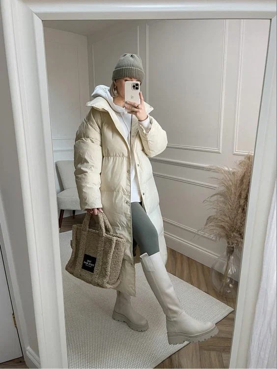 Найкращим вибором для завершення образу з легінсами та пуховиком стануть чоботи труби або високі черевики на грубій підошві.