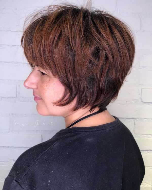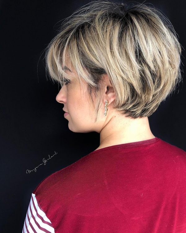 Універсальний та практичний боб хороший і тим, що він візуально може подовжити лінії вилиць. Відкрита шия та зона потилиці додадуть легкості та елегантності цій об’ємній стрижці. Кожна варіація бобу дає свої переваги для жінок з круглим обличчям: