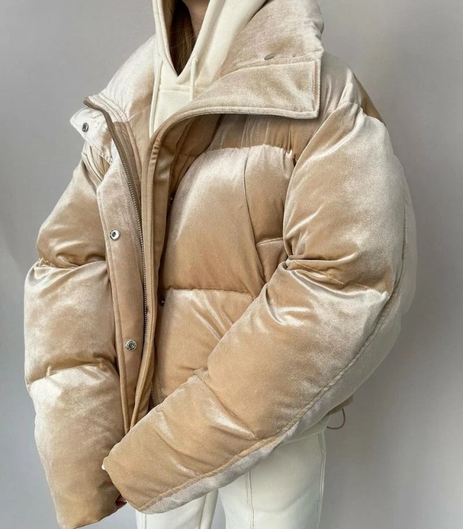 Дизайнери вирішили поекспериментувати з тканинами та запропонували пуховики з оксамиту. Звичайно, така модель непрактична, адже при випаданні опадів куртка промокне наскрізь. Зате виглядає дуже красиво. Жінкам, які їздять своєю машиною, такий варіант цілком підійде – адже на вулиці не доводиться проводити багато часу.