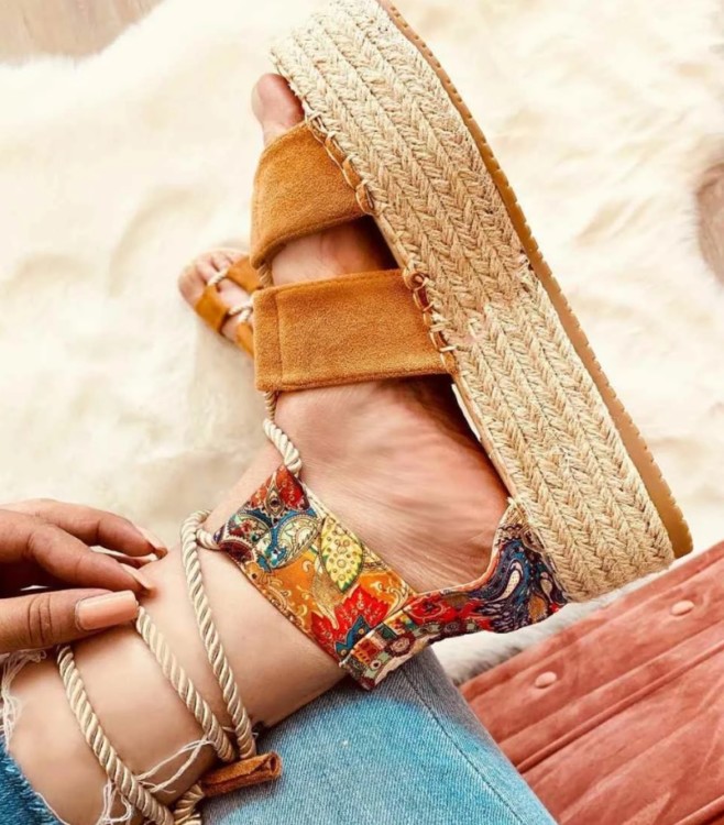 Сандалі на товстій плетеній підошві допоможуть будь-якій жінці візуально витягнути свій силует і зробити ноги і образ в цілому більш привабливими. Зауважимо, що найцікавіше взуття на плетеній підошві поєднується з широким джинсами, шортами, сукнями в стилі бохо.