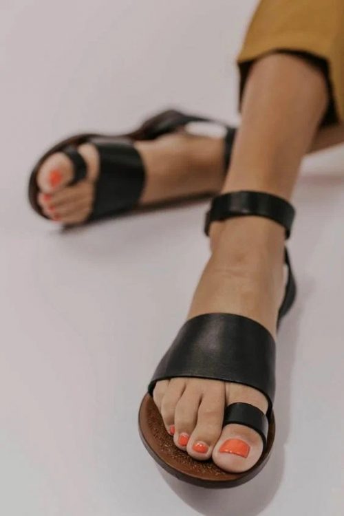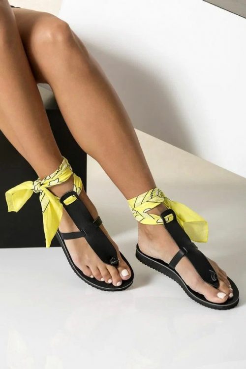 Літній тренд – це мінімалістичні сандалії чорного кольору. Зверніть увагу, як гармонійно чорні сандалії виглядають із жовтою атласною хусткою.