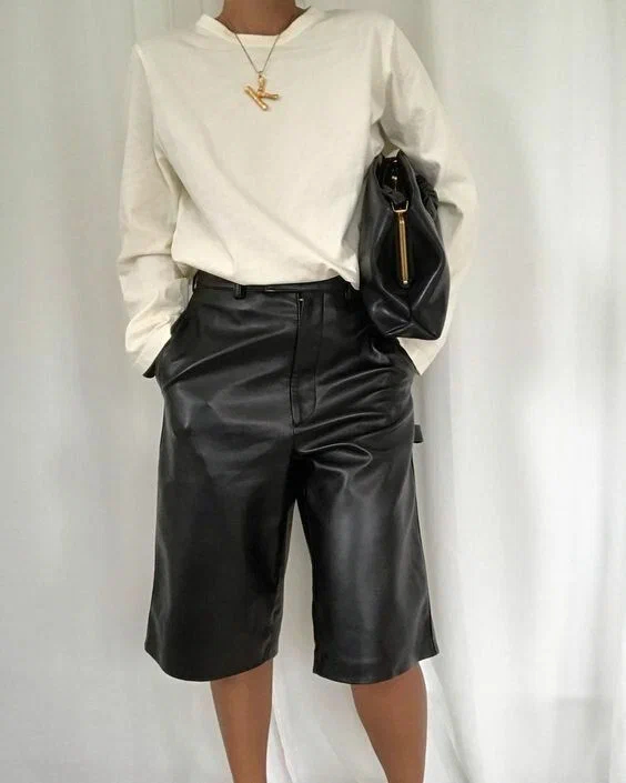 Подовжені шорти-бермуди з натуральної кольорової шкіри – актуальний тренд 2022 року. Шкіряні шорти вільного фасону підійдуть красуням з широкими стегнами та вузькою талією. Ця модель спонукає до складання незвичайних повсякденних образів.