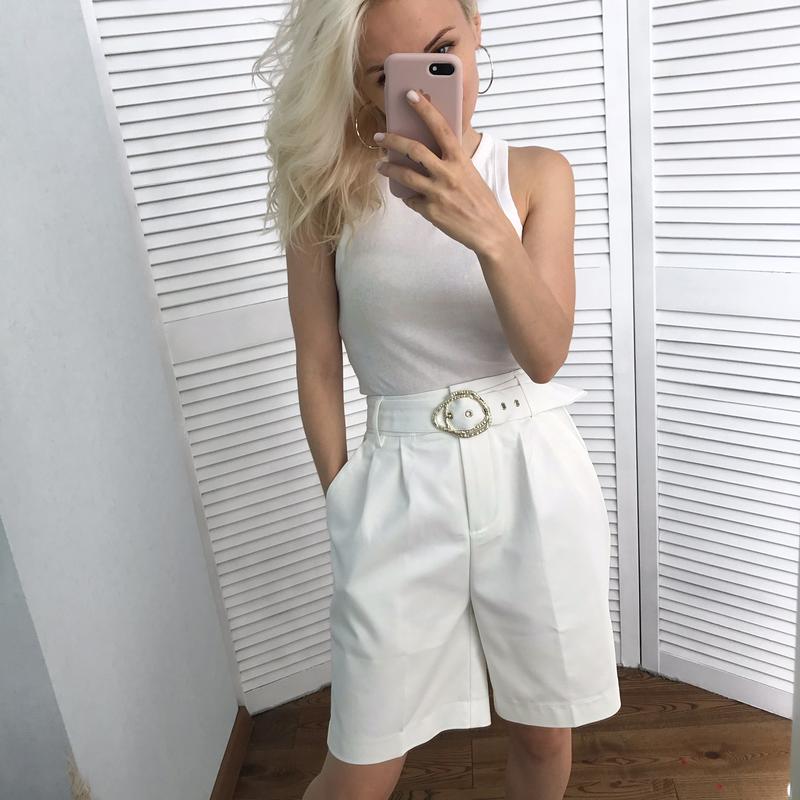 Білий колір також займає лідируючі позиції в сучасній індустрії моди. Білі шорти гармонійно перегукуються з бежевими або світло-сірими піджаками, а також трендовими футболками з вирізами.