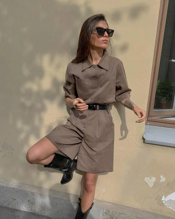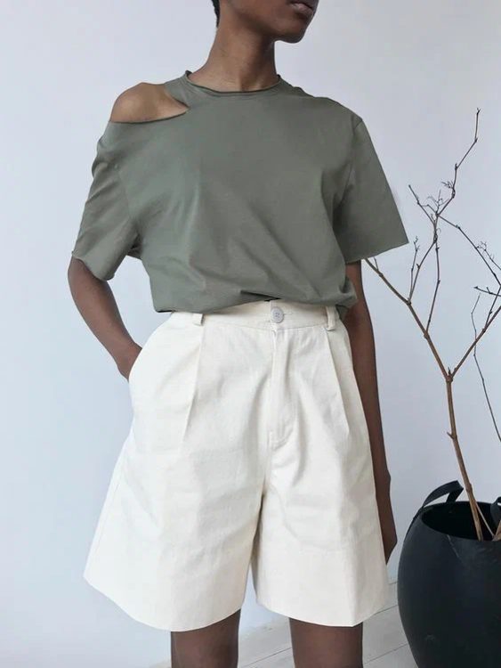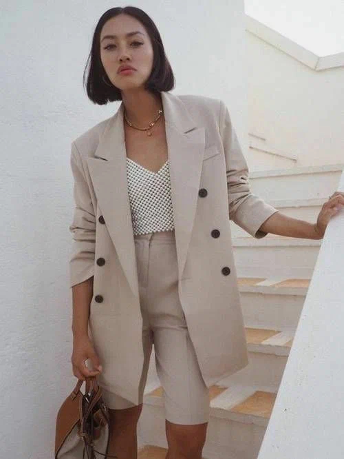 У тренді об’ємні шорти класичного стилю, які доречно поєднуються з оверсайз жакетами, однотонними футболками, а також мінімалістичними босоніжками на високих підборах. Зверніть увагу на колірну комбінацію образу, вона точно передає сучасний тренд 2022 року.
