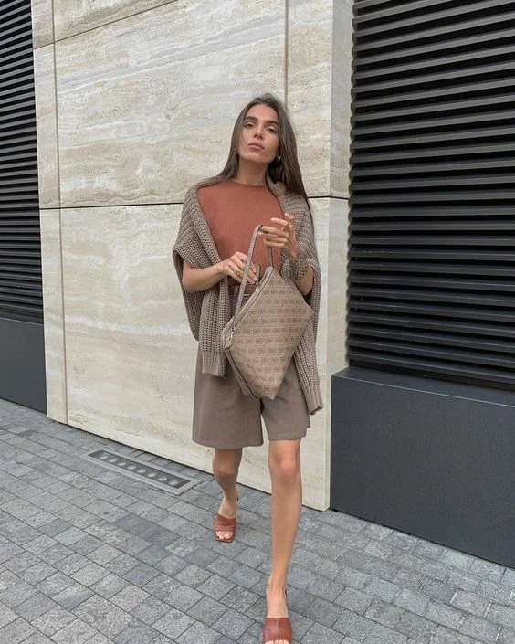 Наступний міський аутфіт з ультрамодними шортами оверсайз, гуру моди доповнили об’ємним трикотажним светром, однотонною базовою футболкою, брендованою сумкою невеликого формату, а також сабо чудового карамельного кольору.