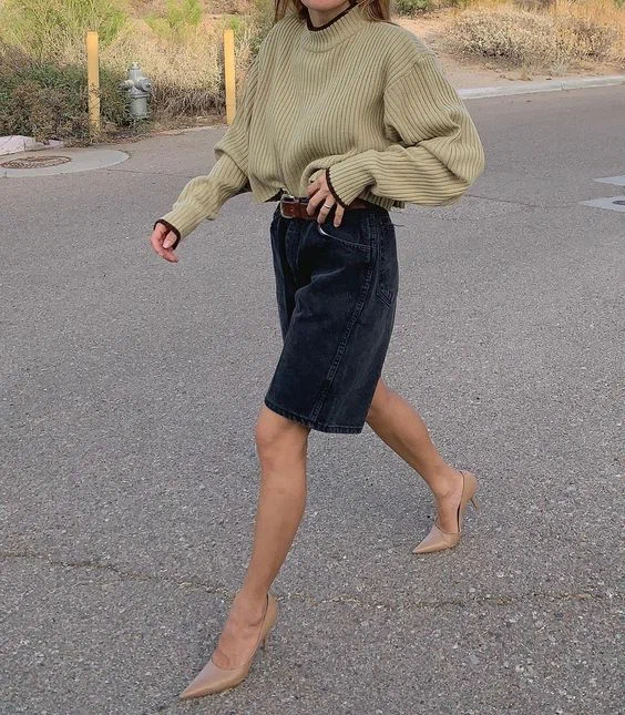 Носити джинсові шорти із завишеною посадкою можна з об’ємними заправленими светрами, сорочками і жакетами або жіночними блузками. В якості взуття до них чудово підійдуть босоніжки на підборах, мюлі, сабо, туфлі або базові сандалії.