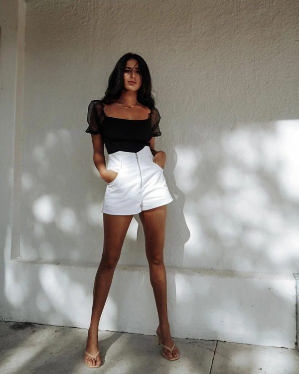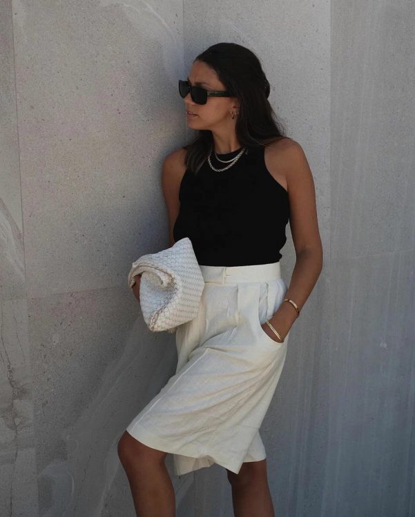 Шорти з підворотами в акцентну вертикальну смужку ідеально впишуться в стилістичні літні образи. Знову ж таки тут вагому роль відіграє білий колір, завдяки якому образи набувають виразного і сучасного вигляду.