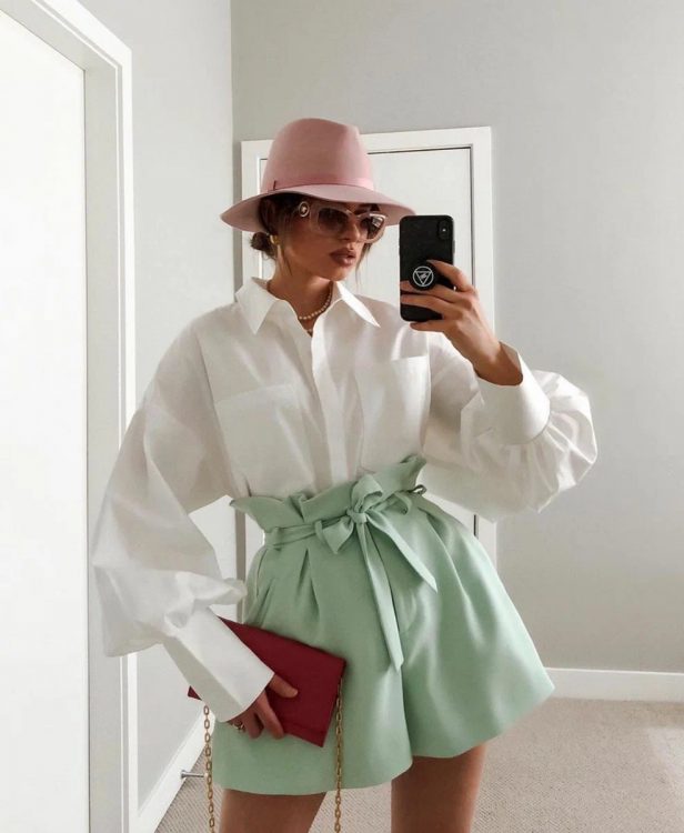 Стилісти звертають нашу увагу на кольорові оверсайз шорти із завищеною талією. Широкий ремінь чудово підкреслить талію і зробить її неймовірно привабливою та стрункою. Просторі штанини допоможуть зробити фігуру пропорційною, а також приховують недоліки фігури.